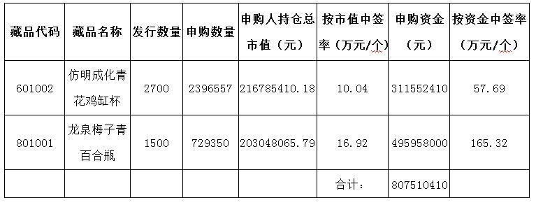 本次中簽分配方式按持倉市值優先分配規則,請廣大參與申購的投資會員關注交易賬號中持倉數量和資金變化情況?!斗旅鞒苫嗷u缸杯》、《龍泉梅子青百合瓶》將于2016年9月26日正式掛牌交易。